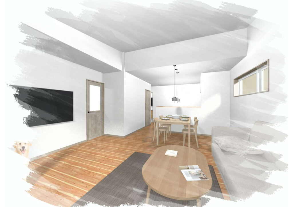リビングの東南方向からキッチン奥方向