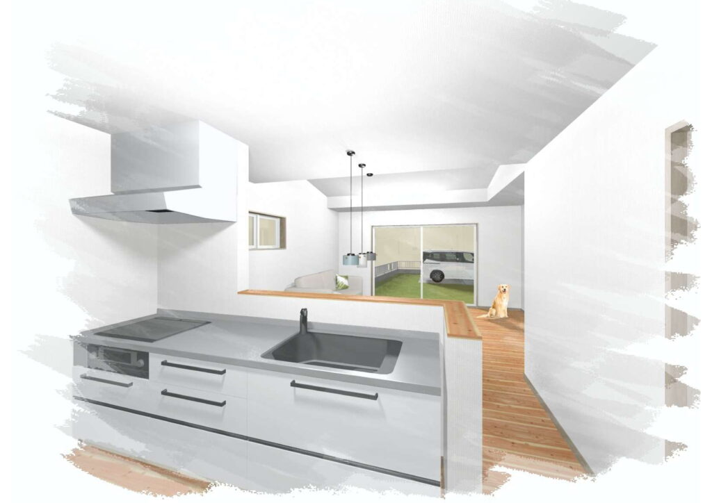 キッチンからの南側へ広がる室内空間