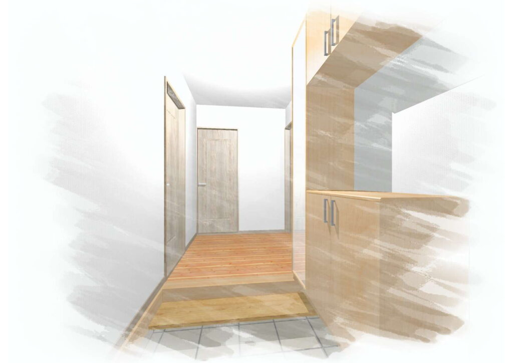 脱衣室と洗面コーナーを分離し、シューズクローク、パントリーを確保
