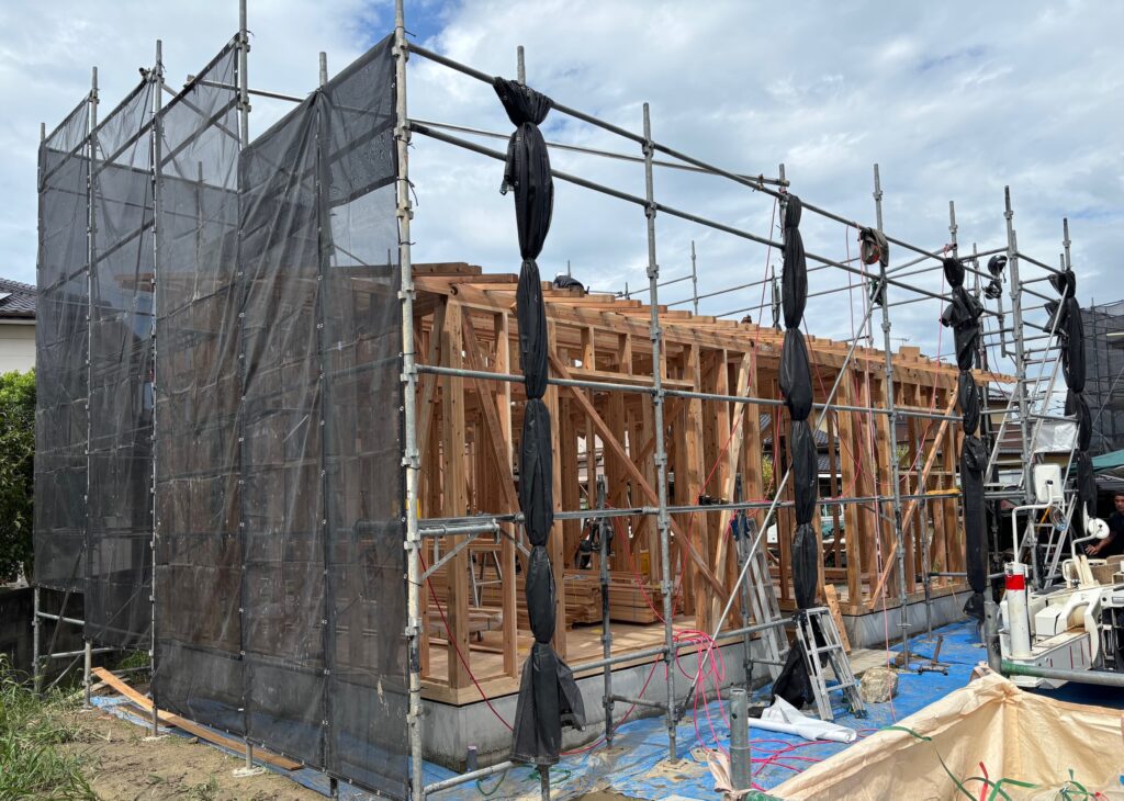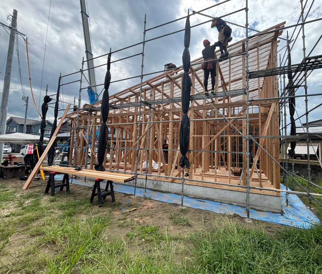 本日、心配された天候も曇り空で無事に棟上げを迎えました。現在は垂木作業が進行中です。