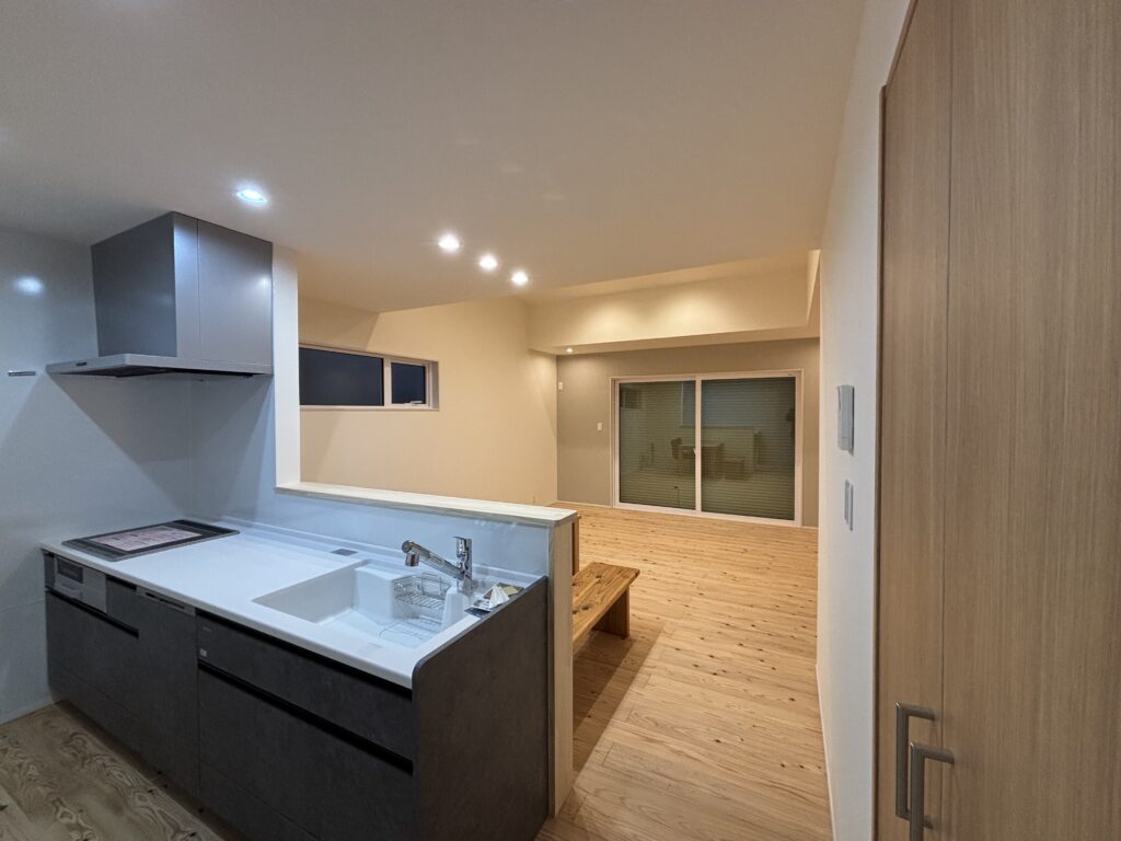 ダイニングサイドから見たリビング、南面はグレーのアクセントクロス