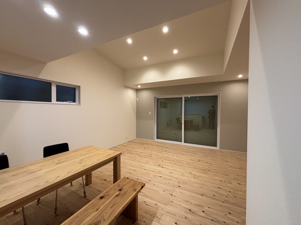 床は無垢の燻煙杉で天井は勾配天井で広々とした空間に仕上げました