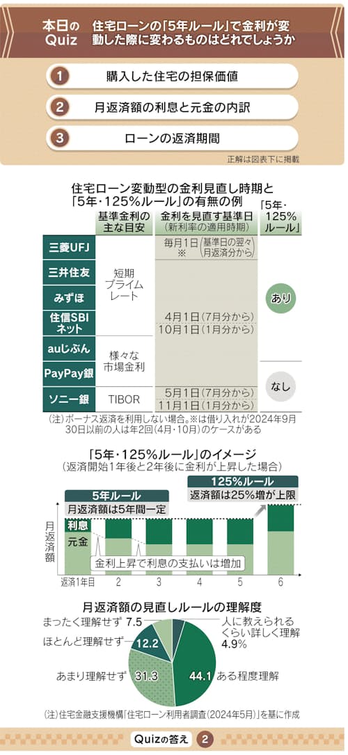 初 変動型では毎月の返済額の変更を原則5年ごととする「5年ルール」がある銀行が多いと聞いたよ。6年目に返済額が増える場合は25%増を上限とする「125%ルール」もあるよね。