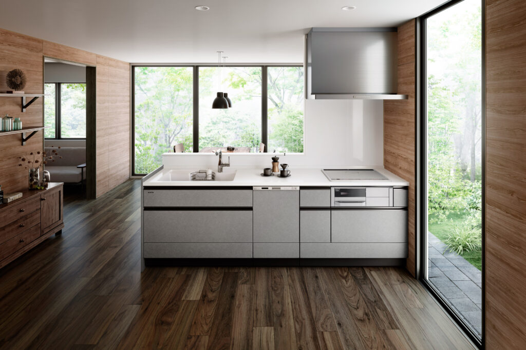 人造大理石一体型のシンク、食器洗い乾燥機、浄水器水栓、お手入れしやすいレンジフード