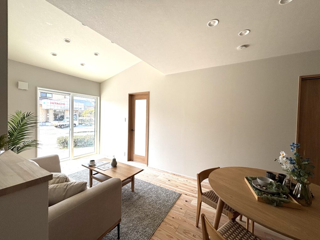 LDKの床は無垢の燻煙杉、リビングは勾配天井に仕上げています